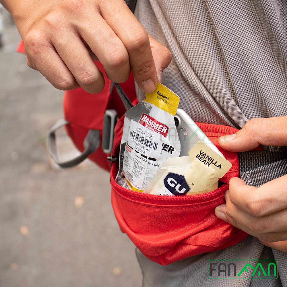 - Trên đai hông có túi nhỏ có thể sử dụng để chứa điện thoại, thực phẩm bổ sung năng lượng