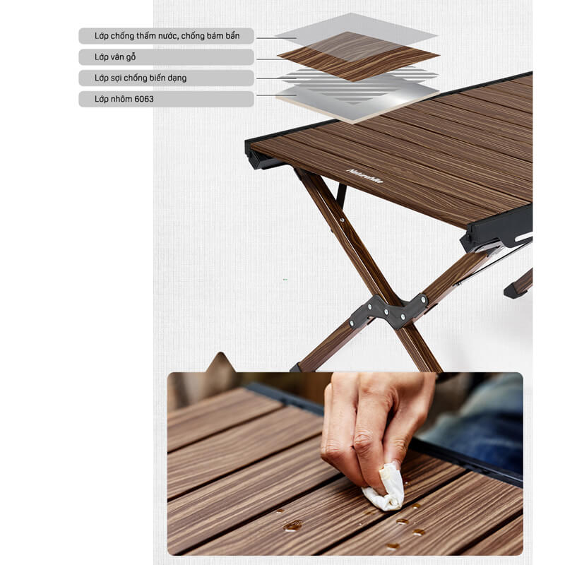 Naturehike CNH22JU043 mẫu bàn nhôm cuộn trứng cho cắm trại, dã ngoại với thiết kế không đơn thuần là một chiếc bàn xếp, dọc 2 bên mép bàn được thiết kế giá treo giúp bạn tối đa diện tích sử dụng bàn. Một số vật dụng có quai, móc hay dây treo có thể được treo lên giá và lấy để sử dụng ngay lập tức khi cần vô cùng tiện lợi. Diện tích mặt bàn lớn thiên về chiều dài đến 125cm thích hợp sử dụng cho những nhóm đông người.