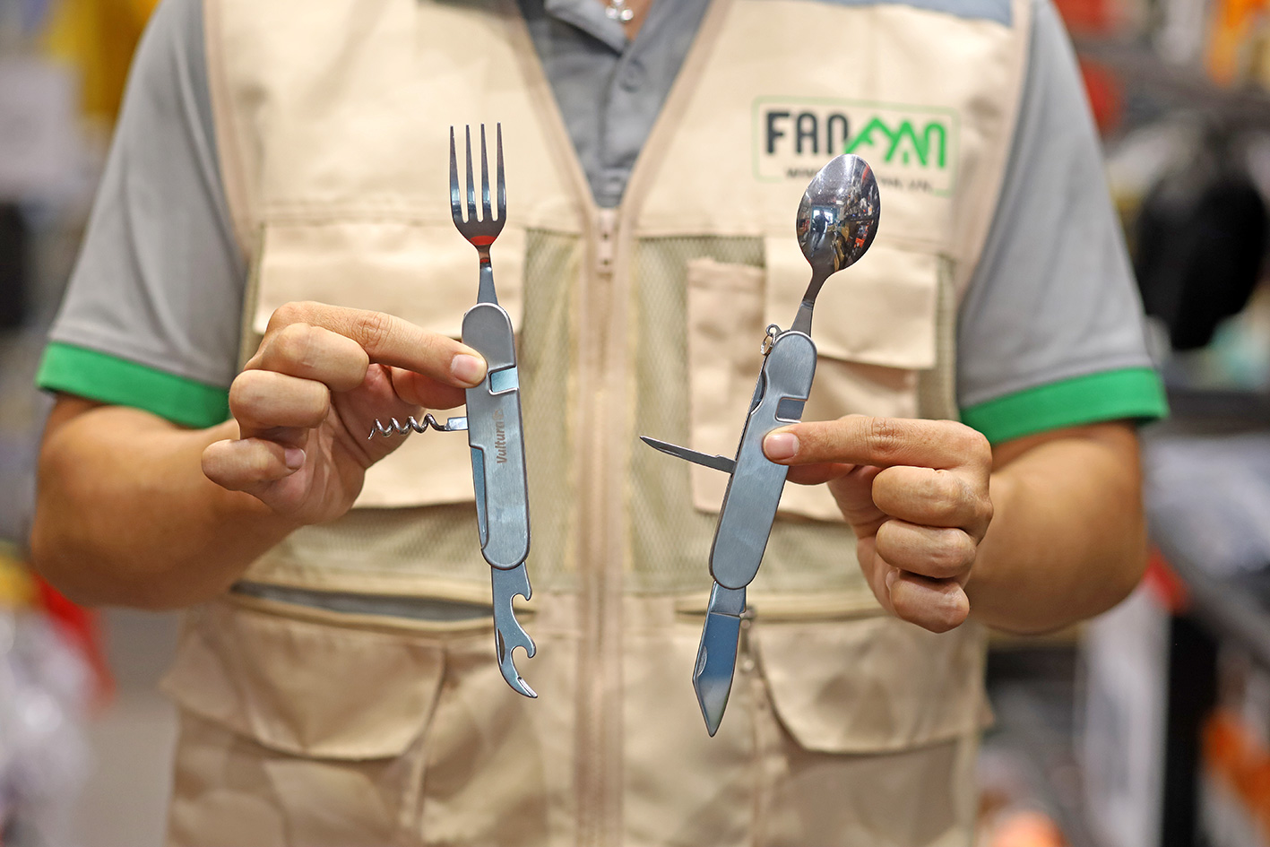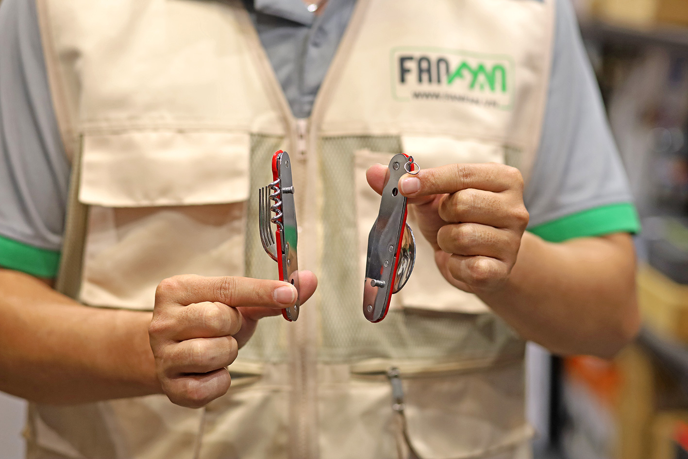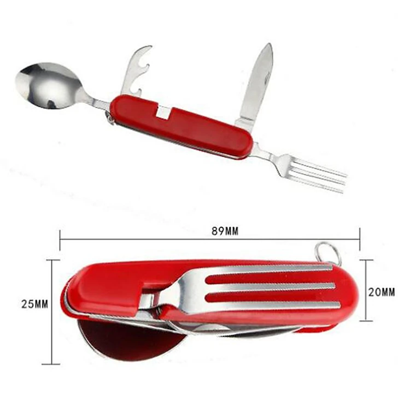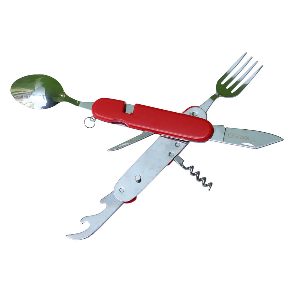 - Bao gồm 6 chức năng: Thìa; Nĩa; Dao; Khui lon đồ hộp; Khui nút bần (rượu); Đầu dùi.