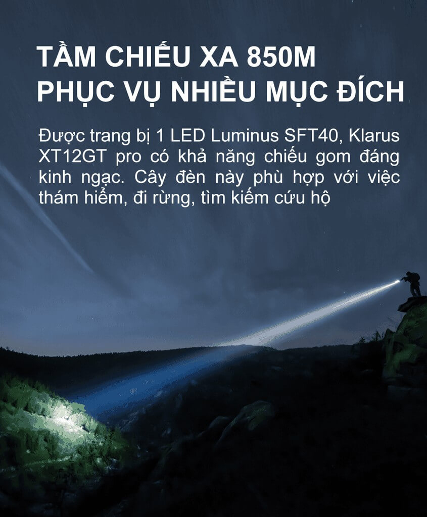 Đèn pin cầm tay Klarus XT12GT PRO - phiên bản cải tiến của XT12GT, sử dụng 1 LED Luminus SFT40 có độ sáng 1.600 lumen và tầm chiếu xa 850m. Dễ dàng sử dụng và có bộ công tắc kép phản ứng nhanh thế hệ thứ 5. KLARUS XT12GT pro sẽ là sản phẩm cực kì phù hợp cho những công việc thường xuyên làm việc ban đêm và dùng để đi dã ngoại, leo núi, đi rừng,..
