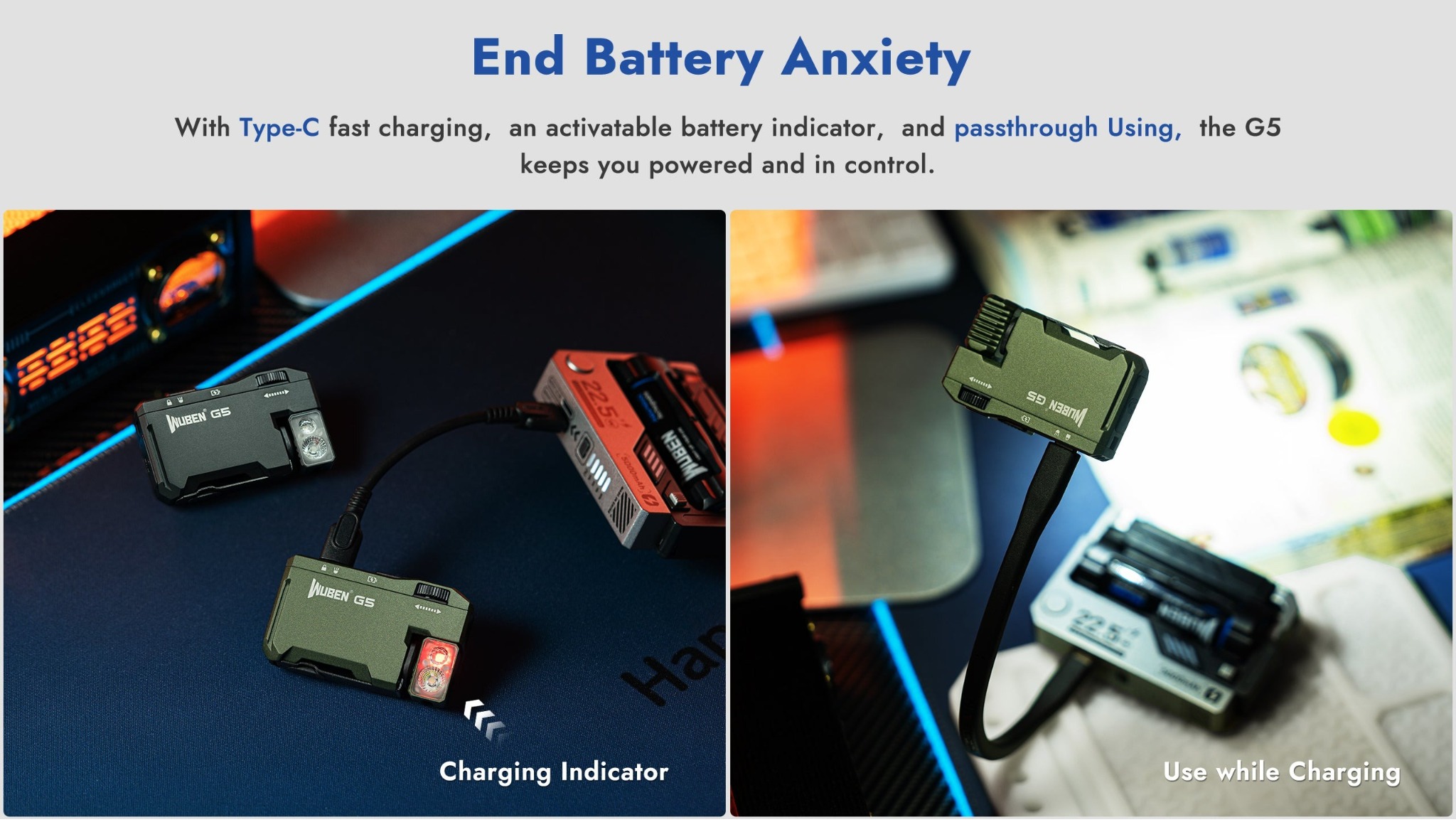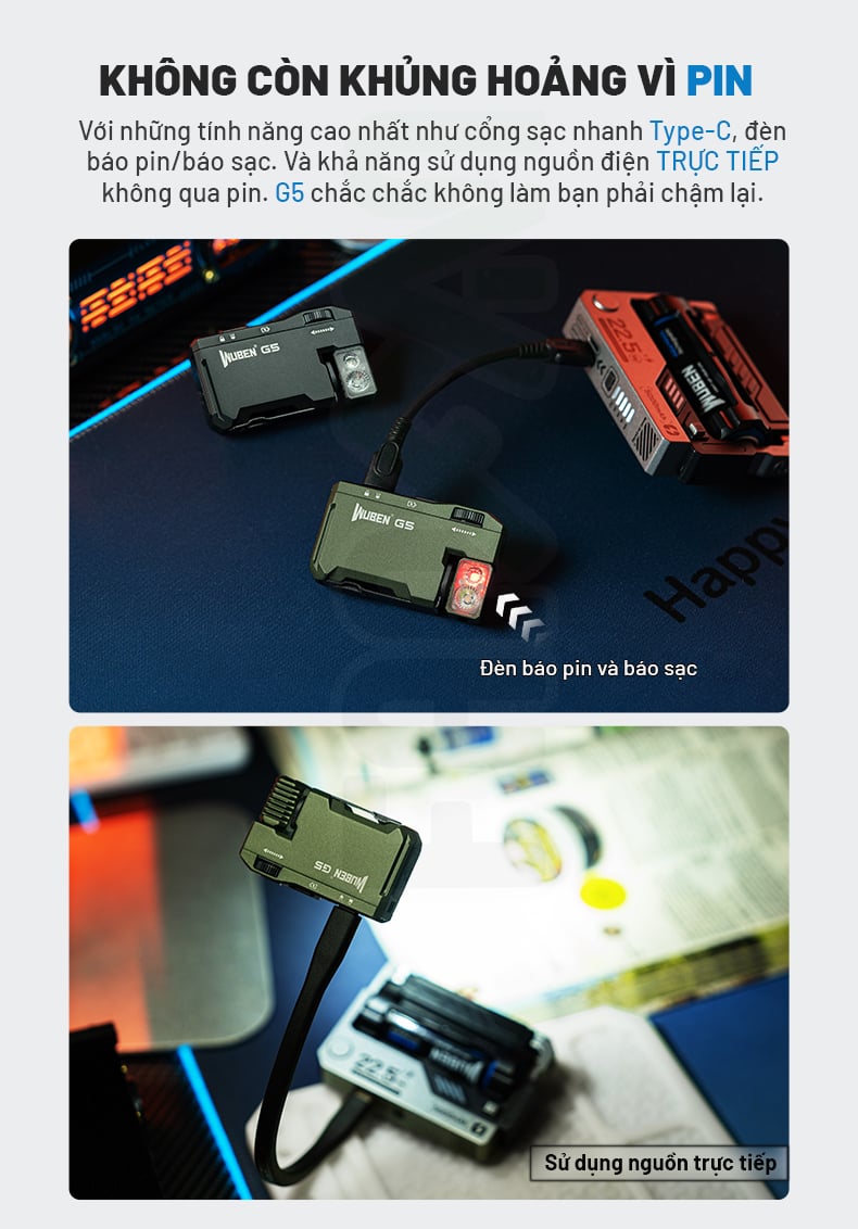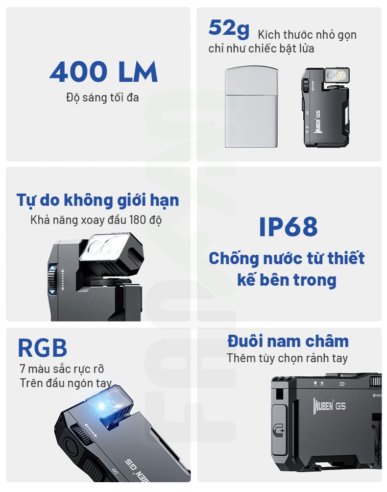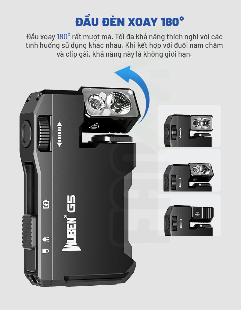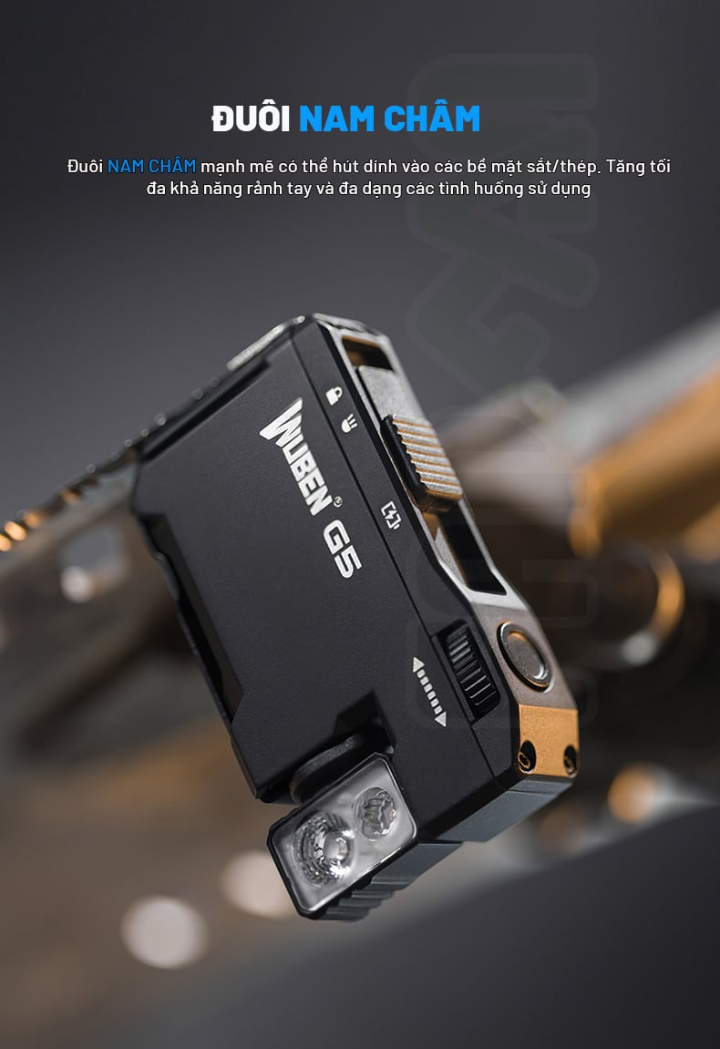 Điều làm nên sự khác biệt của G5 là khả năng sử dụng linh hoạt của nó: bạn có thể gắn đèn vào mũ lưỡi trai để chiếu sáng rảnh tay, kẹp vào balo hay túi xách để sử dụng như một đèn tín hiệu, hoặc sử dụng nam châm tích hợp để gắn vào bất kỳ bề mặt kim loại nào. Wuben G5 là sự lựa chọn hoàn hảo cho những ai cần một nguồn sáng đáng tin cậy, đa năng và dễ dàng mang theo bên mình.