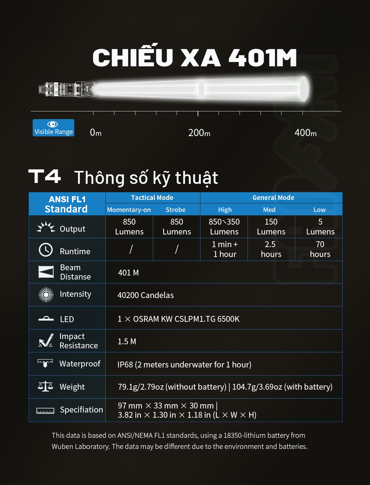 Độ sáng và khả năng chiếu xa ấn tượng : Đèn pin sử dụng led Osram KW CSLPM1.TG nhiệt màu 6500K đạt độ sáng 850 Lumen với kích thước gói gọn trong lòng bàn tay cùng khả năng chiếu xa lên tới 401m.