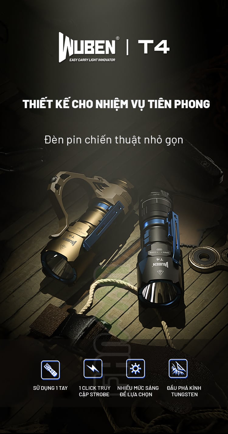 Đèn pin Wuben T4 không chỉ là một chiếc đèn pin, mà còn là một công cụ chiến thuật mạnh mẽ và đáng tin cậy. Được thiết kế với sự kết hợp hoàn hảo giữa hiệu suất cao và độ bền vượt trội, T4 nhanh chóng trở thành lựa chọn hàng đầu cho những người yêu thích dã ngoại, những người làm nhiệm vụ chuyên nghiệp hay đơn giản là người dùng hàng ngày muốn có một thiết bị chiếu sáng nhỏ gọn nhưng mạnh mẽ. Với thân đèn làm từ hợp kim nhôm hàng không vũ trụ, khả năng chống nước và chống va đập ấn tượng, Wuben T4 sẵn sàng đồng hành cùng bạn trong mọi điều kiện khắc nghiệt.