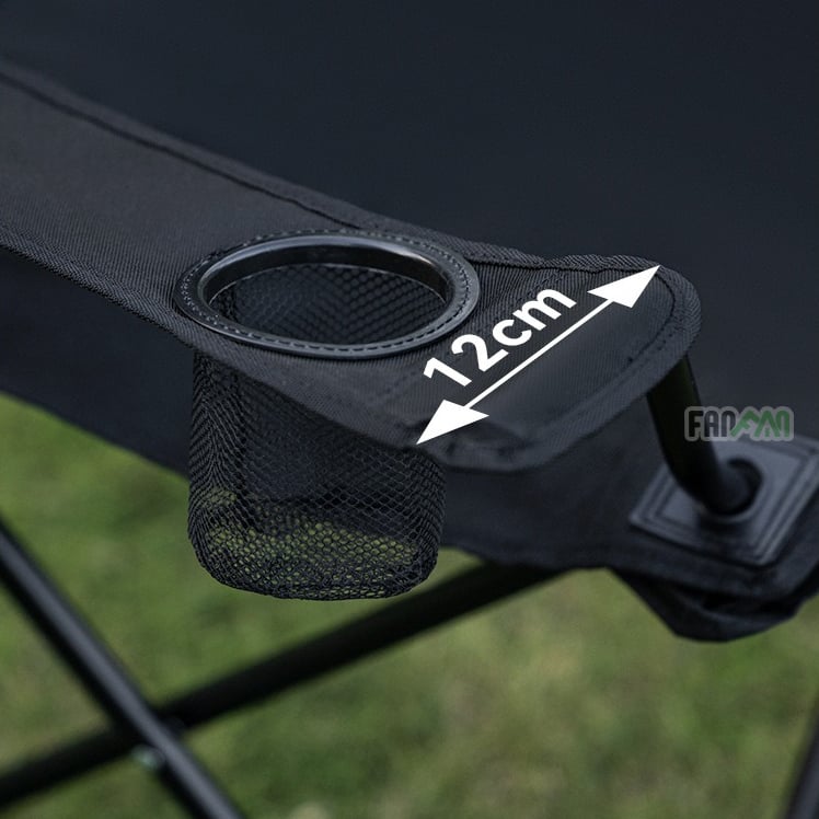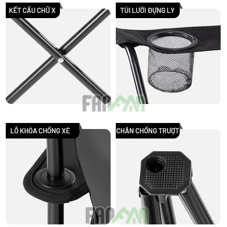 Kết cấu khung đan chữ X giúp tăng tải trọng của ghế, chịu được tối đa là cặp mông 150kg. Cùng những yếu tố phụ không phù hợp lắm với mức giá rẻ của nó chút nào như tựa tay 2 bên rộng 12cm tích hợp túi lưới đựng ly. Mặt ghế cách đất tới 40cm thuộng hạng tương đối cao so với ghế cắm trại thông thường, giúp góc co duỗi chân tốt hơn.