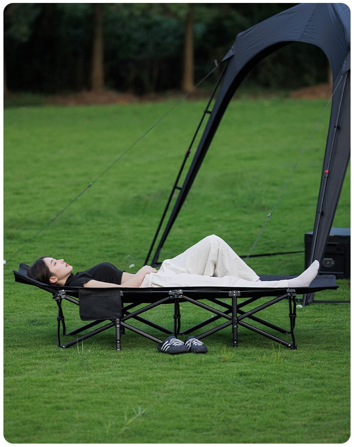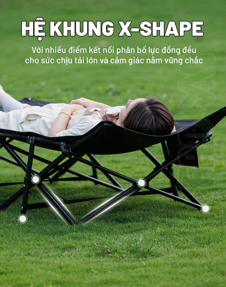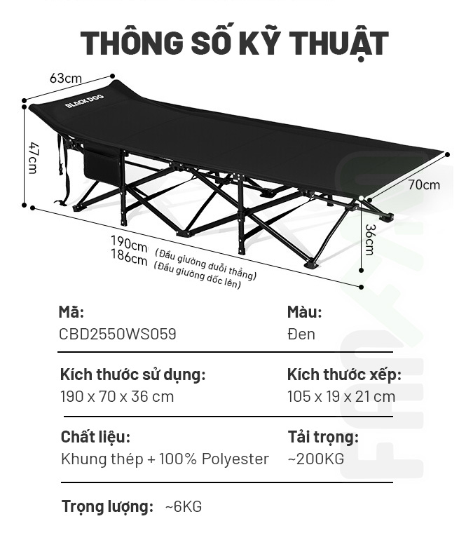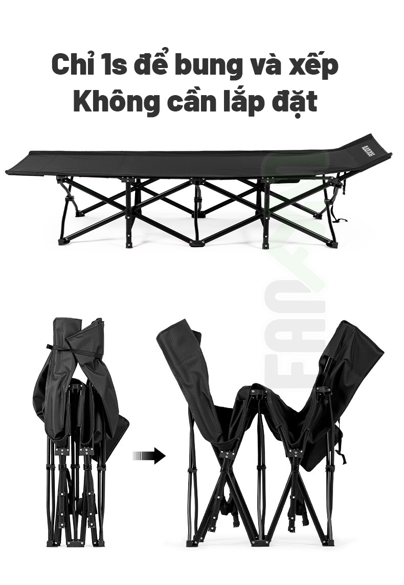 Blackdog CBD2550WS059 là mẫu giường cot camping xếp gọn rất khác biệt với những mẫu giường khác khi không yêu cầu lắp ráp. Nó đơn giản chỉ cần bung ra và gấp lại, thao tác chỉ mất khoảng 1s. Cùng tính năng công thái học độc nhất: Đầu giường có thể duỗi thẳng hoặc điều chỉnh tăng giảm độ dốc, bạn hoàn toàn có thể ngủ mà không cần tới gối, tính năng này giúp giảm áp lực lên đầu & cổ so với khi nằm thẳng. Hệ khung X-Shape bằng thép đan chéo với nhiều điểm kết nối để phân bổ lực đồng đều mang tới cảm giác nằm vững chắc và ổn định hơn hẳn so với các loại giường lắp ráp khung nhôm.