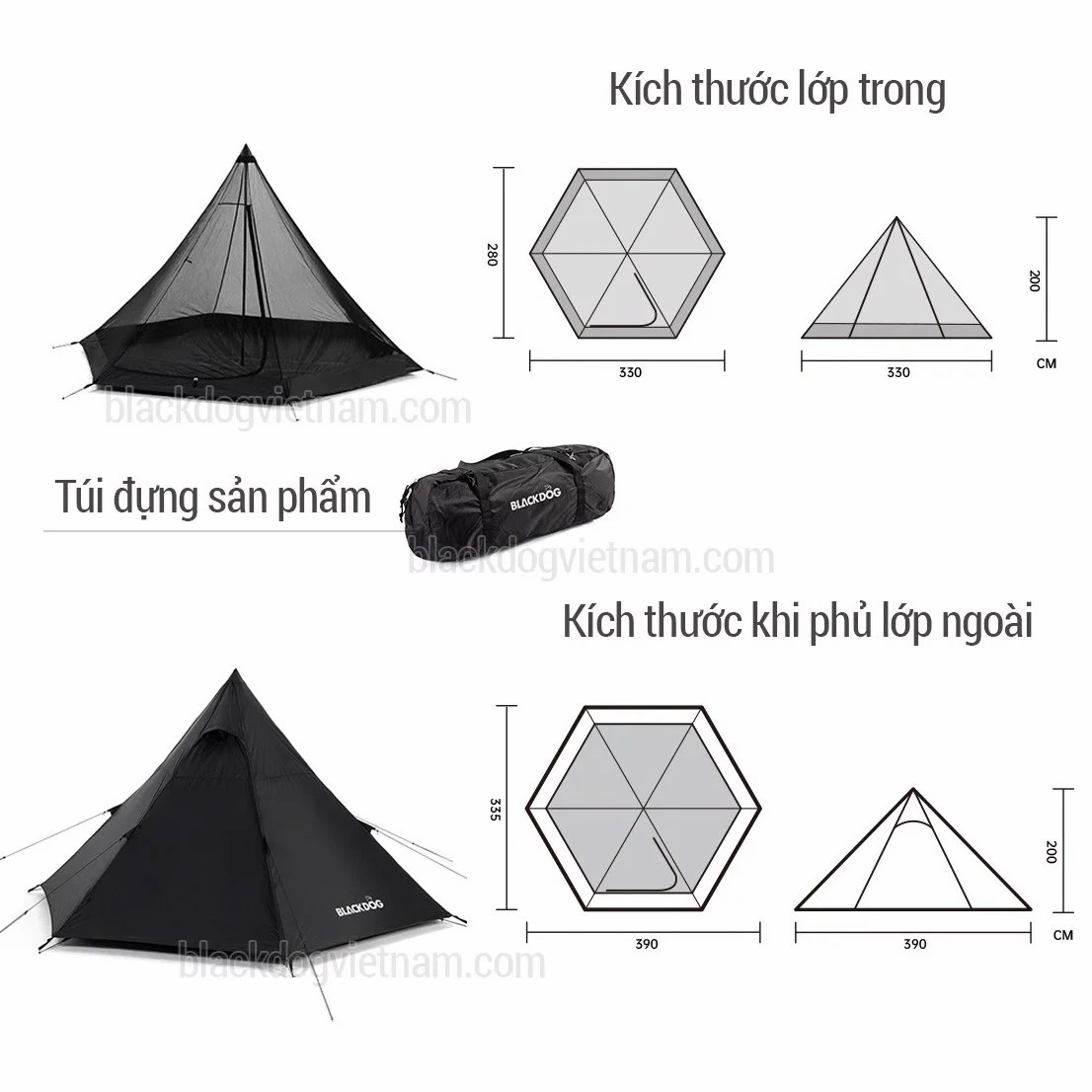 - Kích thước lều: 390 x 335 x 200 cm