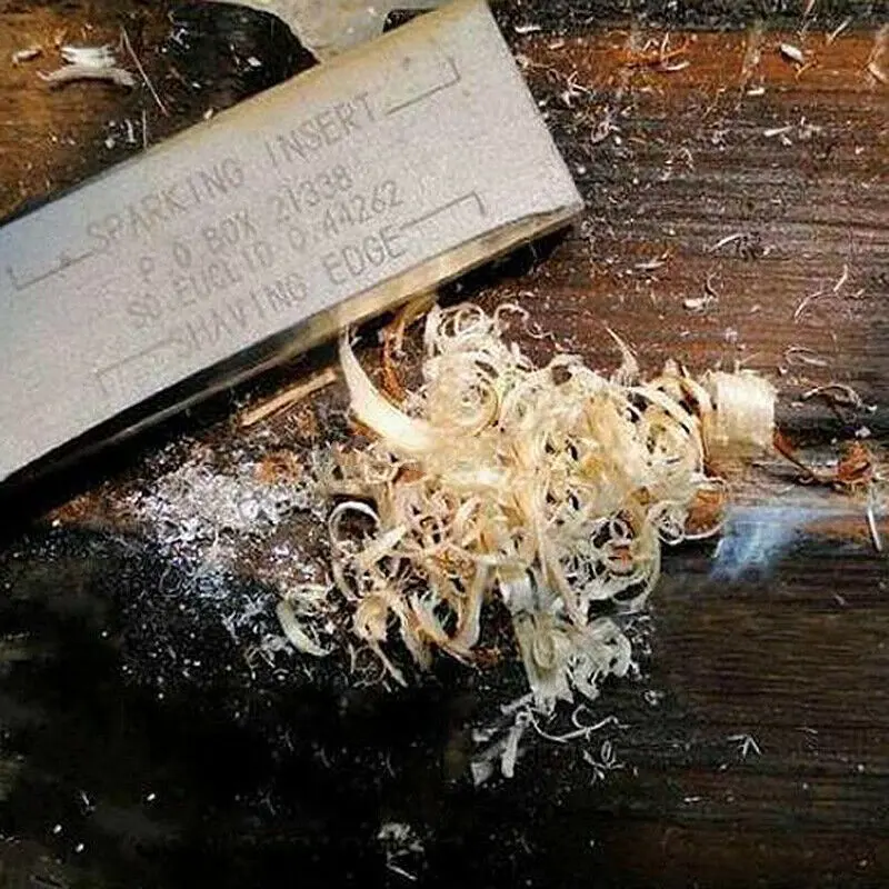 ...Sau đó sử dụng thanh cạo đi kèm (hoặc lưỡi dao) cạo mạnh thanh đá lửa, hướng tia lửa vào đống bột/sợi magie trên bùi nhùi, đám bột magie sẽ bắt lửa và lập tức đốt cháy bùi nhùi bằng sức nóng >3000℃.
