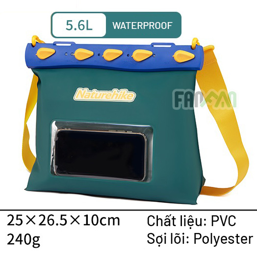 Túi đeo chéo chống nước Naturehike CNK2300BS016 bằng chất liệu PVC chống nước hoàn toàn. Hệ thống miệng khóa tối ưu có thể chịu được dưới 20m nước mà không bị thấm. Chiếc túi này rất phù hợp để đựng những đồ đạc thiết yếu trong các chuyến chơi biển, hồ, hoặc các môn thể thao với nước như chèo thuyền, chèo SUP.