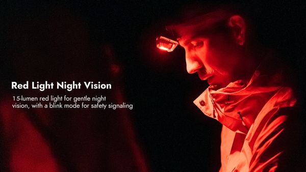Ngoài ra Wuben H4 còn được trang bị bóng LED đỏ 15 Lumens cho khả năng duy trì tầm nhìn ban đêm (mắt người sẽ điều tiết dễ dàng hơn trong môi trường ánh sáng đỏ) dễ dàng quan sát trong khi vẫn tiết kiệm năng lượng.