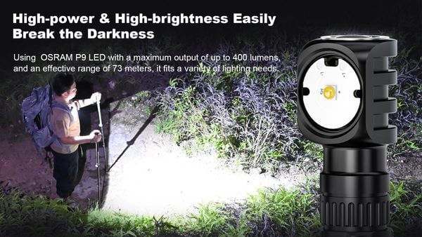 - Khả năng chiếu sáng mạnh mẽ : Sử dụng nhân LED OSRAM P9 đạt độ sáng tối đa lên đến 400 Lumens kết hợp với thấu kính TIR mang lại một giải pháp quang học hiệu suất cao, khi đèn có thể chiếu xa lên đến 73m và góc tỏa rộng lên đến 175 độ, cung cấp một khu vực chiếu sáng rộng và tầm nhìn bao quát.
