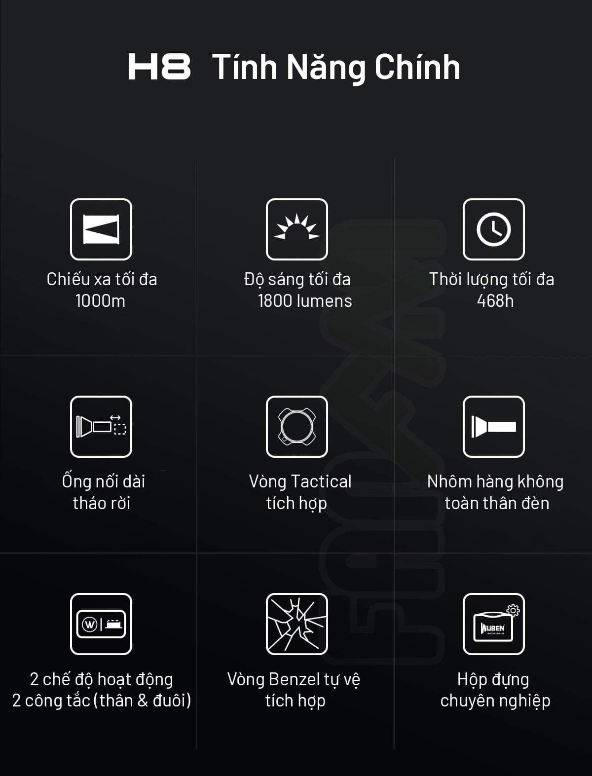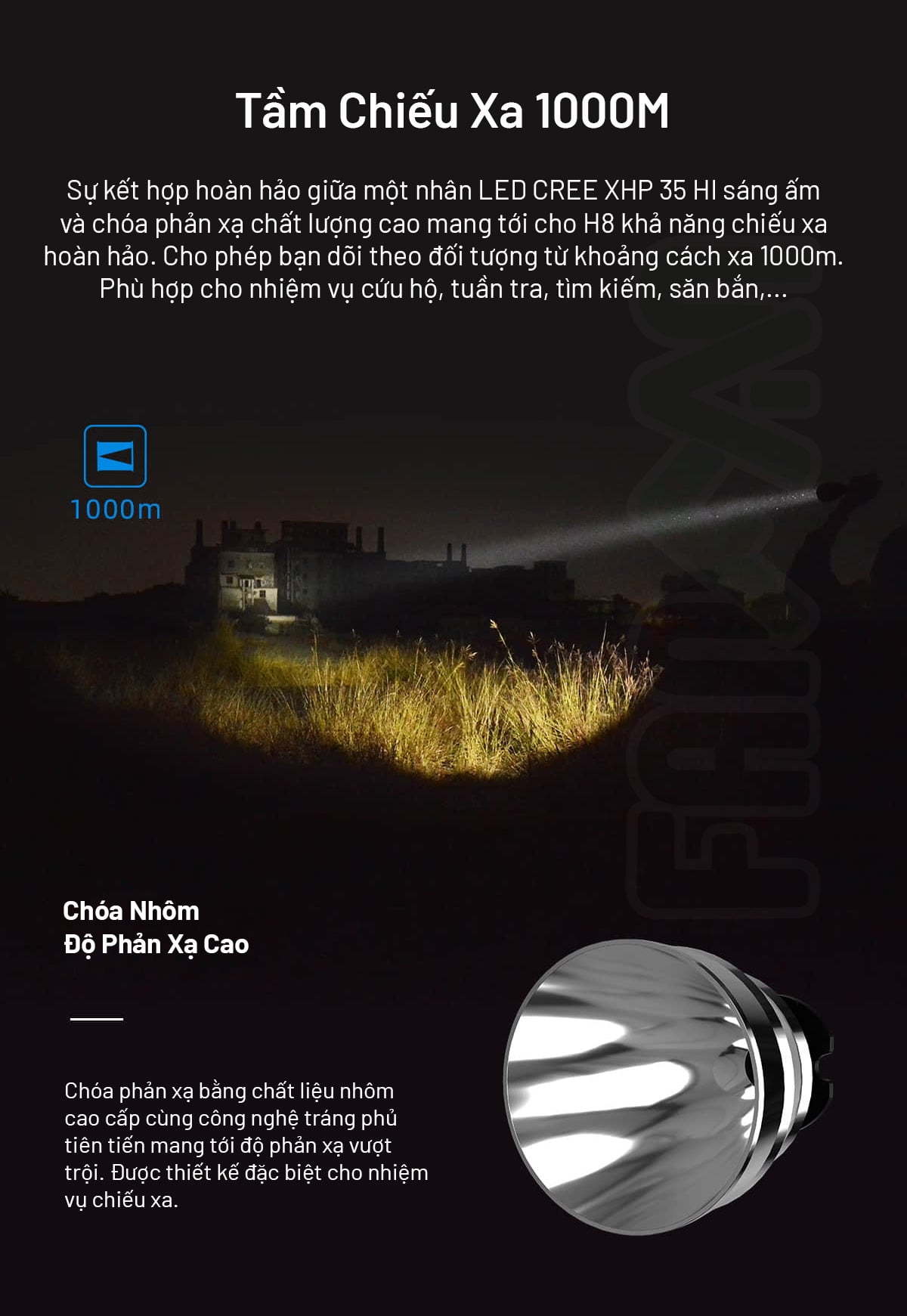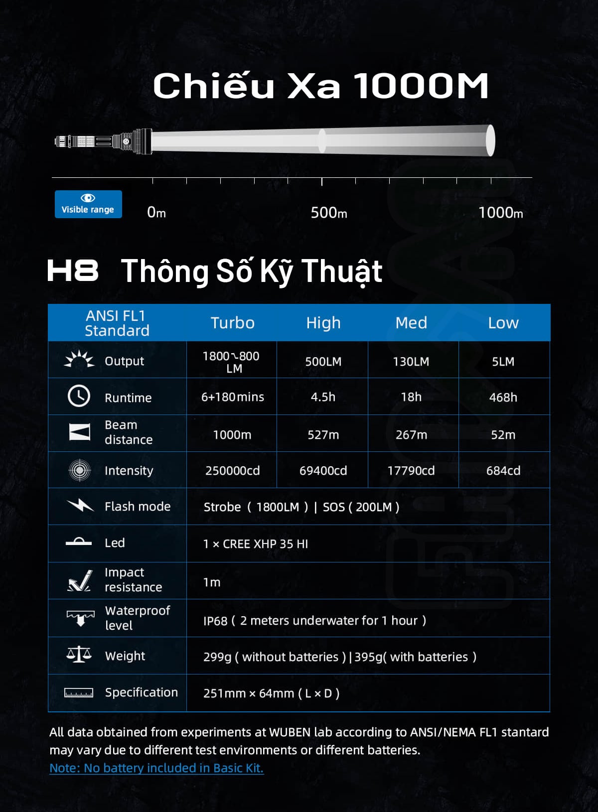 H8 là chiếc đèn pin có hiệu suất cao nhất của Wuben. Mặc dù không chạy đua thông số Lumen như các loại đèn pin cùng phân khúc khác, nhưng H8 tận dụng 1800 Lumens của mỉnh rất triệt để. Đem đến hiệu suất chiếu xa đáng kinh ngạc 1000m (1 cây số) và thời lượng sử dụng lâu dài lên tới 468h với 2 viên pin sạc 18650 3400mAh (ở chế độ tiết kiệm nhất).
