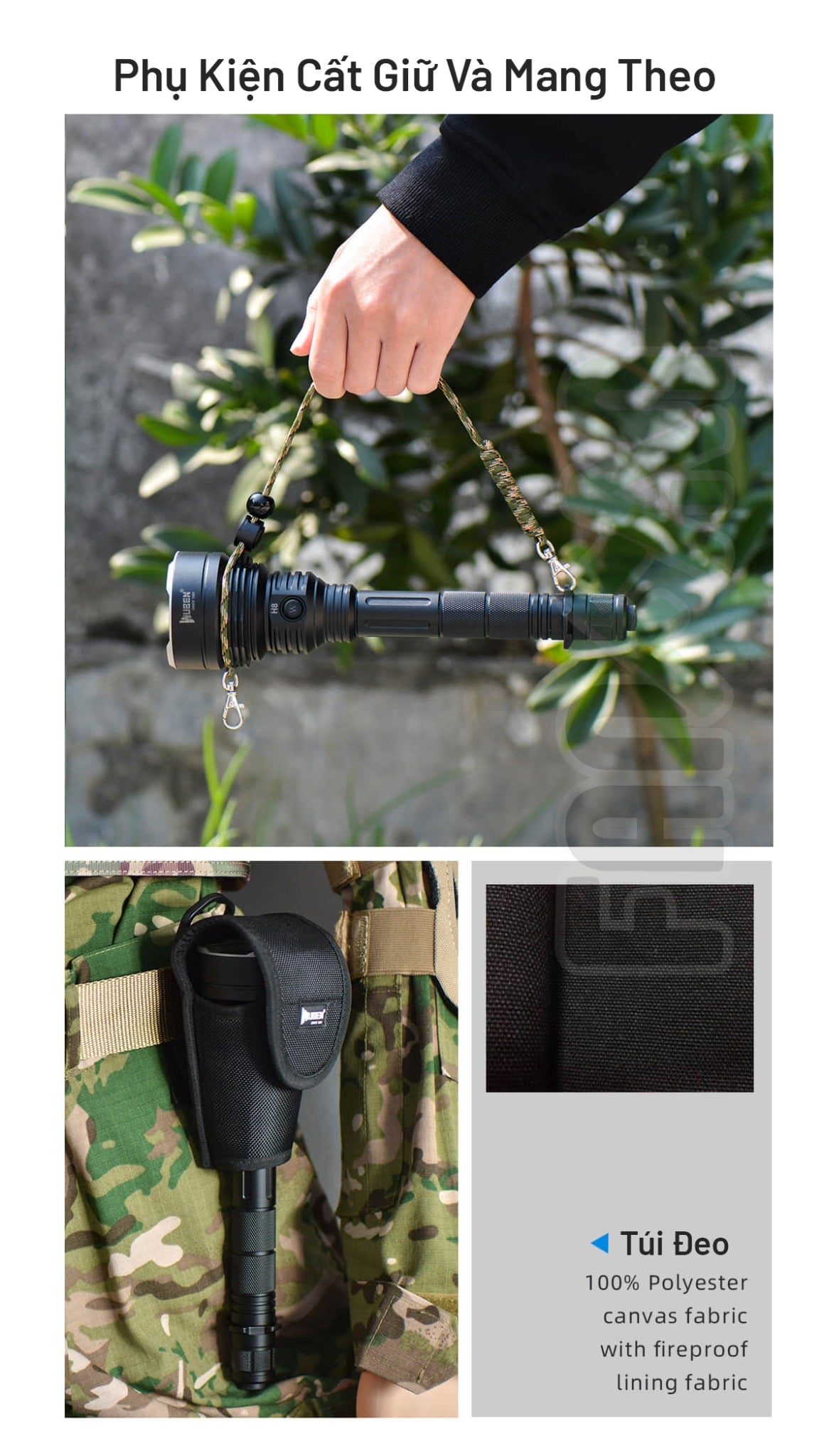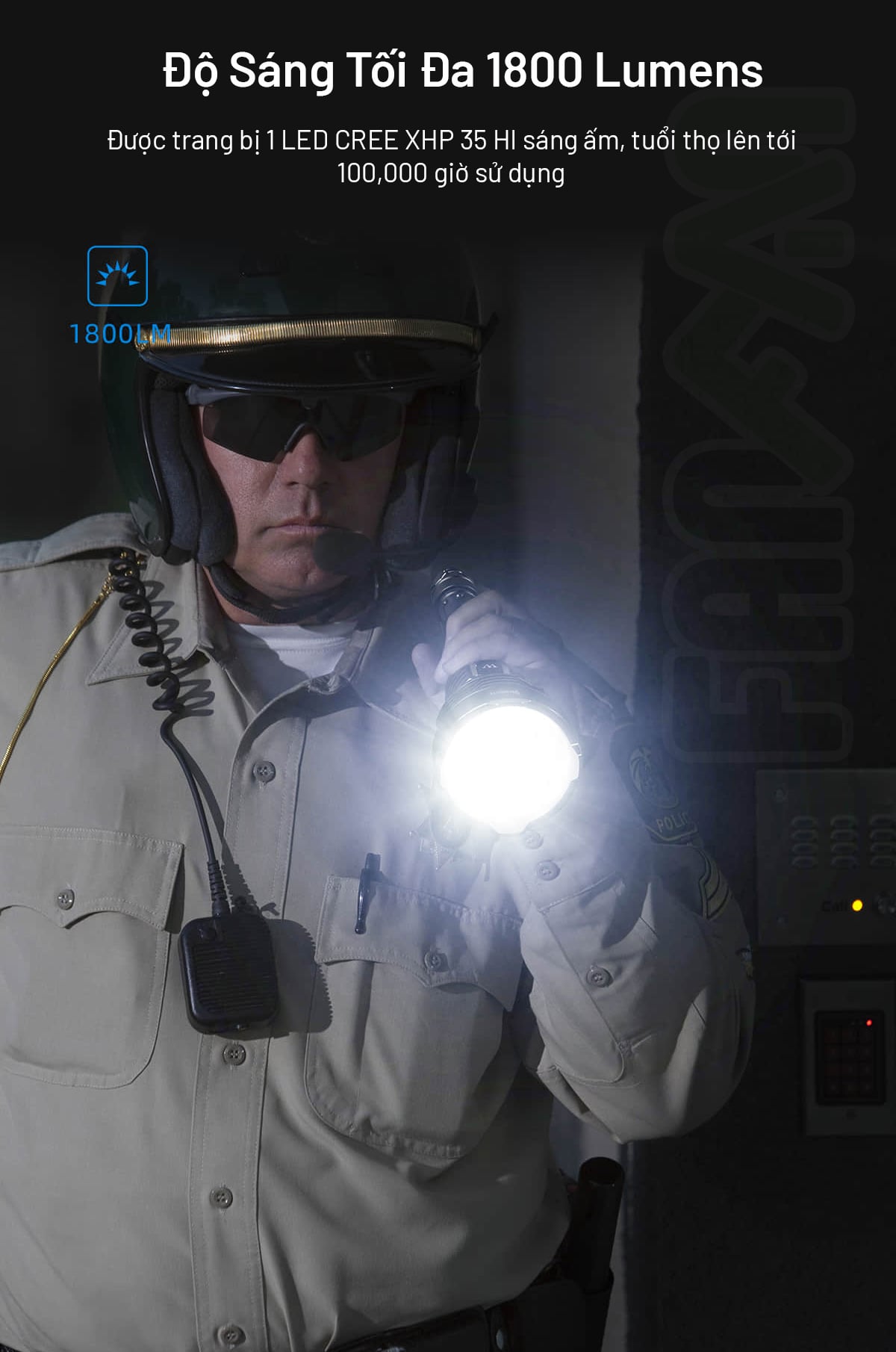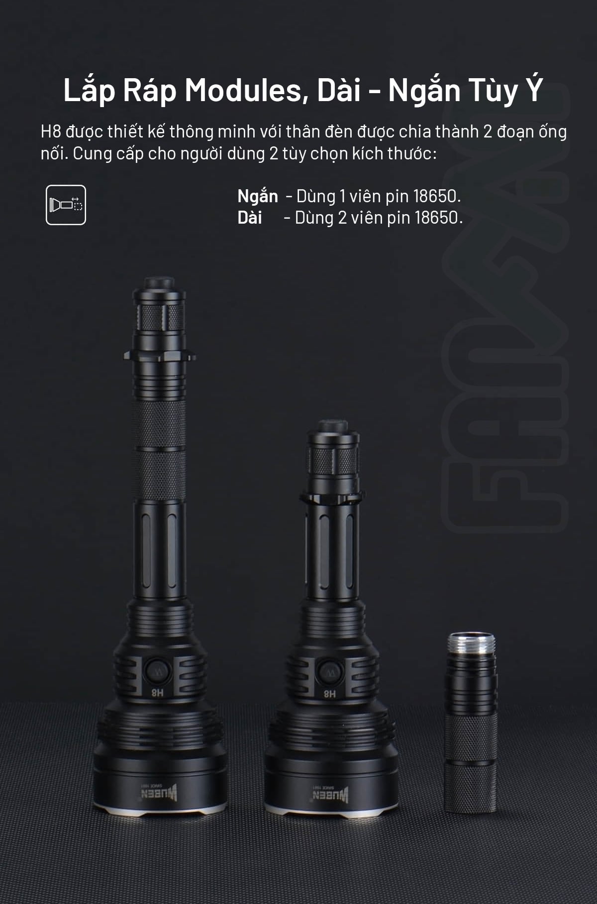 H8 là chiếc đèn pin có hiệu suất cao nhất của Wuben. Mặc dù không chạy đua thông số Lumen như các loại đèn pin cùng phân khúc khác, nhưng H8 tận dụng 1800 Lumens của mỉnh rất triệt để. Đem đến hiệu suất chiếu xa đáng kinh ngạc 1000m (1 cây số) và thời lượng sử dụng lâu dài lên tới 468h với 2 viên pin sạc 18650 3400mAh (ở chế độ tiết kiệm nhất).
